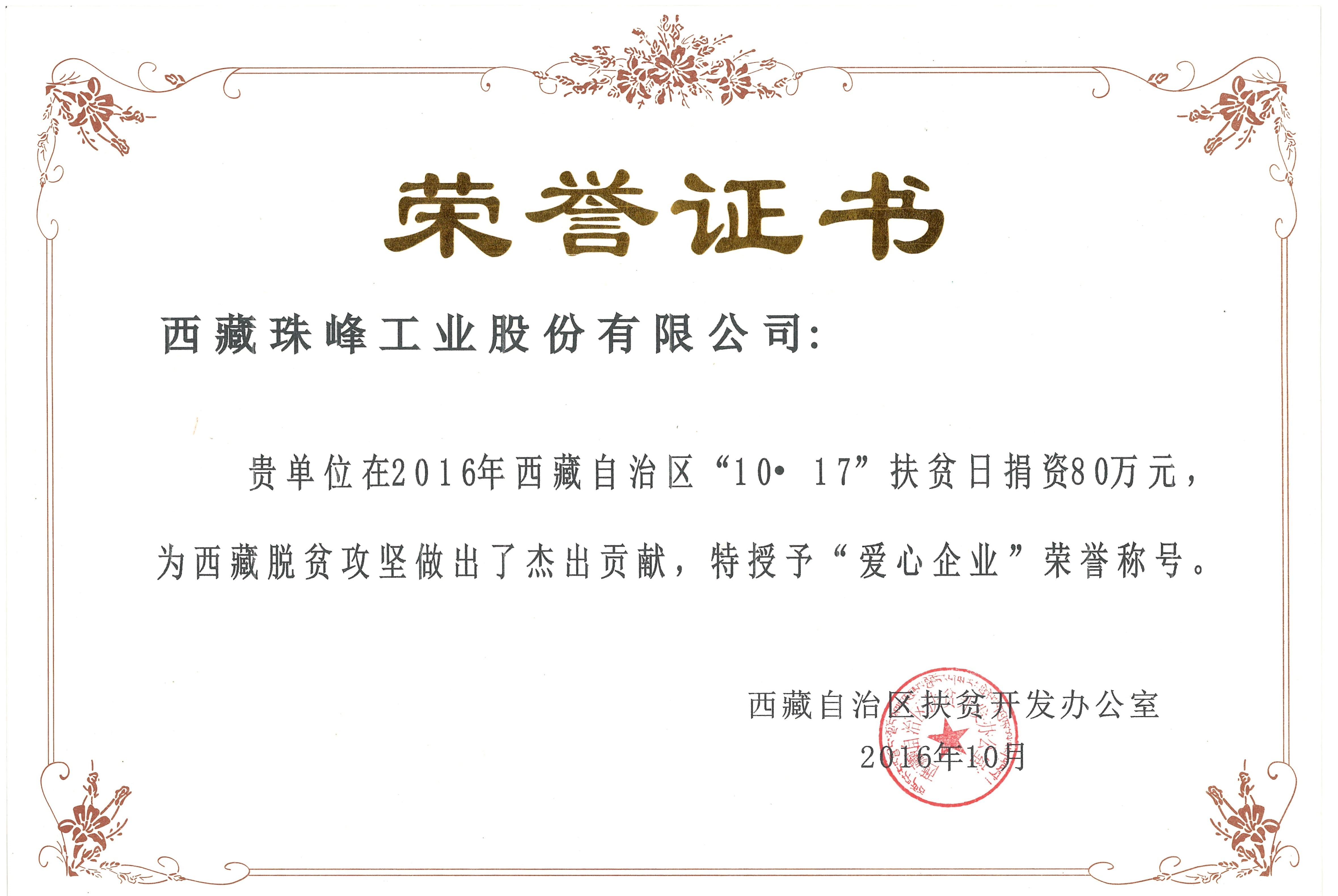 西藏自治區授予“愛心企業”稱號